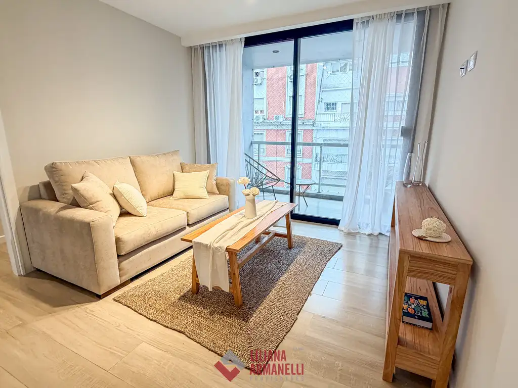 Departamento de 2 ambientes a estrenar. Amplio living comedor a la calle con balcón saliente. Cocina separada con ventilación natural y amoblamiento a medida. Heladera. Lavarropas. Dormitorio a la calle con placard y baño en suite. Toilette. Muebles a estrenar. 62 mts. Ubicado en Plaza Colón.