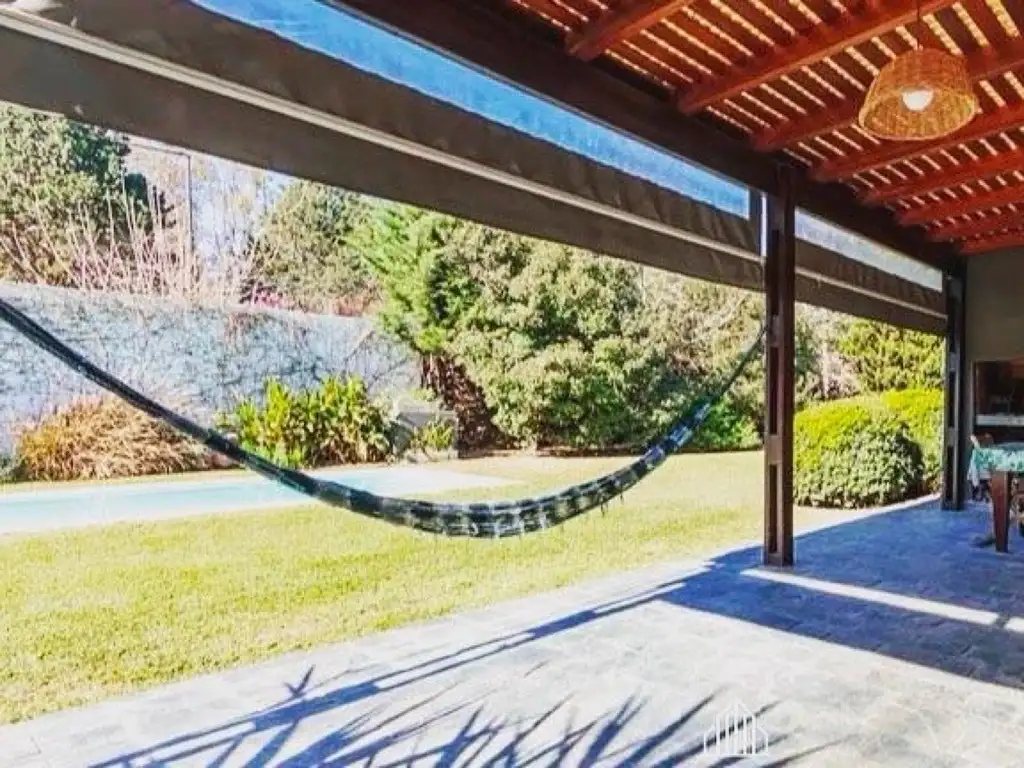 Espacios comunes integrados: Cocina, comedor y living conforman un gran ambiente luminoso, con ventanales que ofrecen vistas al jardín y la pileta. La cocina cuenta con una amplia isla central que también conforma el sector del comedor, ideal para reuniones y momentos en familia. El living destaca por su cálido hogar a leña.