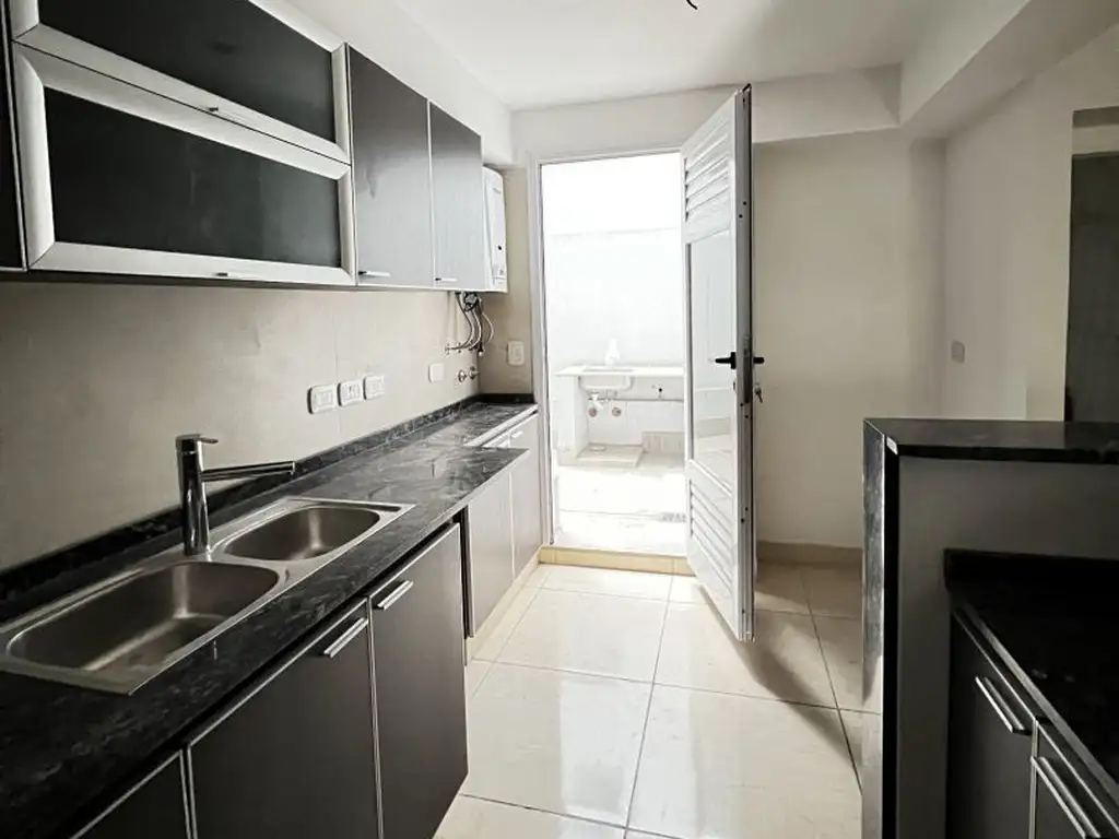 Cocinas de 3 y 4 ambientes completamente equipadas, con mesada de granito negra, muebles bajo mesada y alacena, cocina marca domec con anafes a gas, bacha doble, instalación para lavarropas y lavavajillas