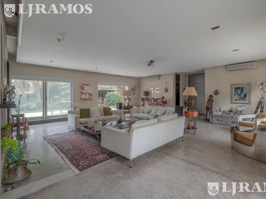 Amplio living muy luminoso, con chimenea, pisos de cemento alisado y ventanales que permite interacción con el verde del exterior.