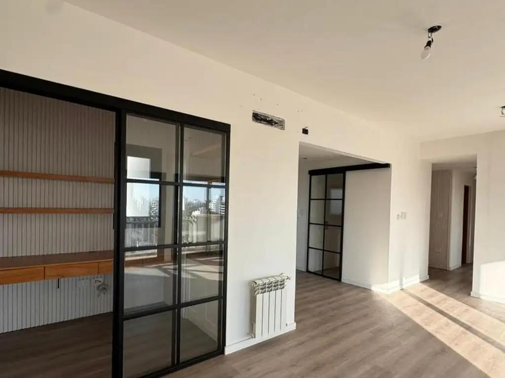 Living-comedor luminoso con ventanales al frente y balcón corrido con vista directa a Plaza Olazábal.