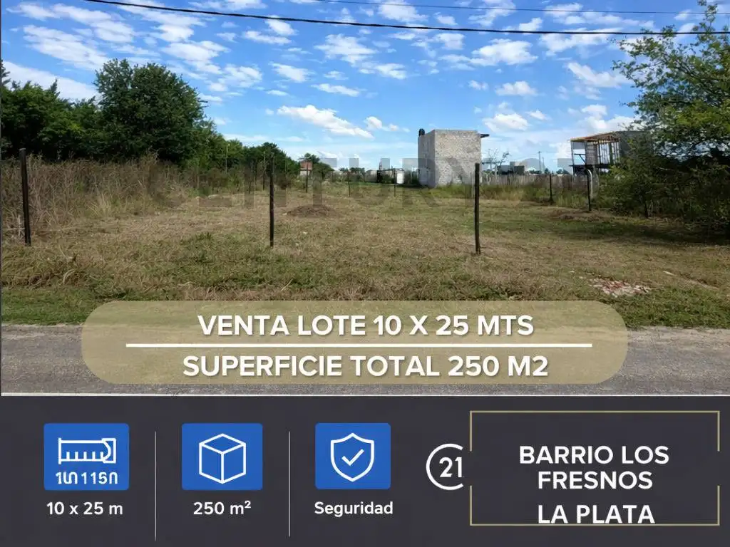 Venta de lote de 10 metros de frente por 25 metros de fondo, con una superficie total de 250 m², ubicado en el Barrio Semicerrado Los Fresnos, en calles 412 y 179 de Arturo Seguí, partido de La Plata.
