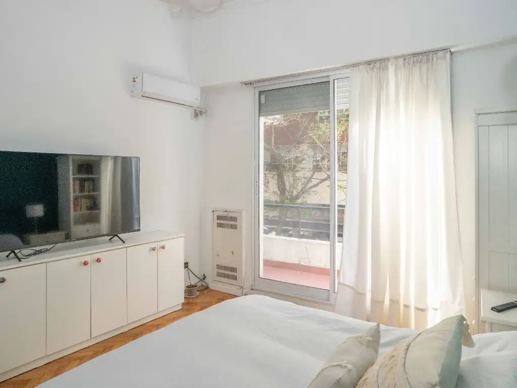 Características destacadas incluyen techos altos que generan sensación de amplitud, aberturas modernas con aislamiento acústico y térmico, y parquet en perfecto estado. Los dos baños han sido completamente renovados, con espacios de ducha y excelentes terminaciones.