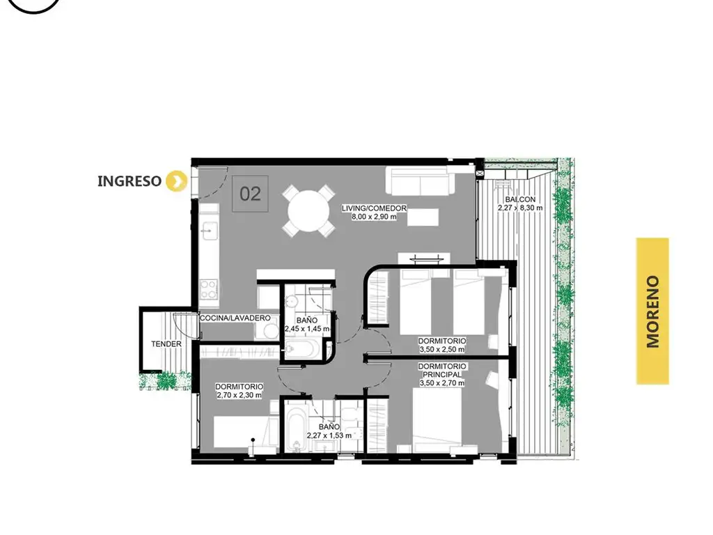 Cuenta con estar comedor, cocina integrada, balcón, tres dormitorios y baño completo. La organización interior permite un funcionamiento práctico para vivienda familiar, con buena iluminación natural.