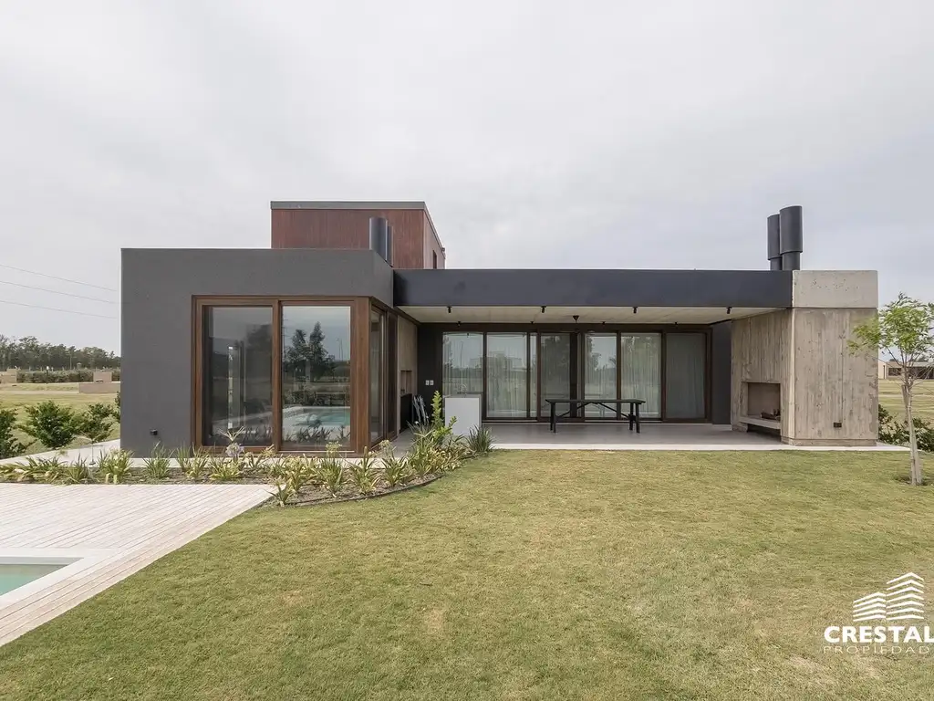 Casa contemporánea implantada sobre amplio lote dentro de barrio privado consolidado con seguridad y entorno residencial de baja densidad.