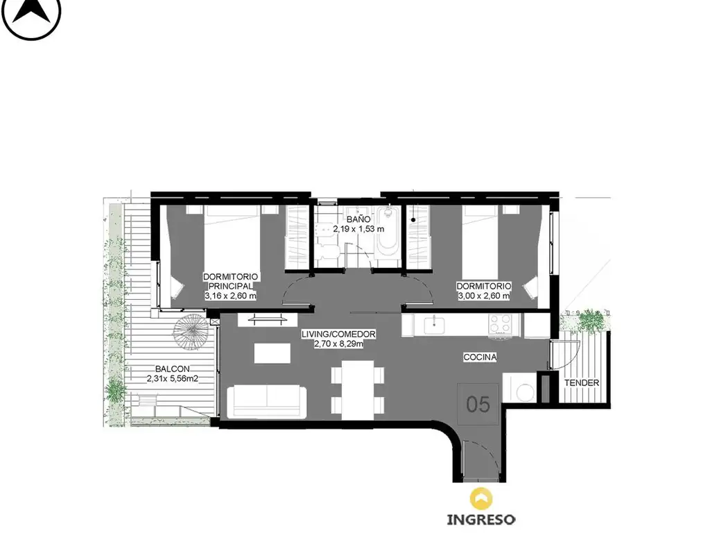 Se compone de living comedor con cocina integrada y salida a balcón, dos dormitorios y baño completo. La distribución plantea un área social integrada y sector privado diferenciado, con ventilación e iluminación natural en los principales ambientes.