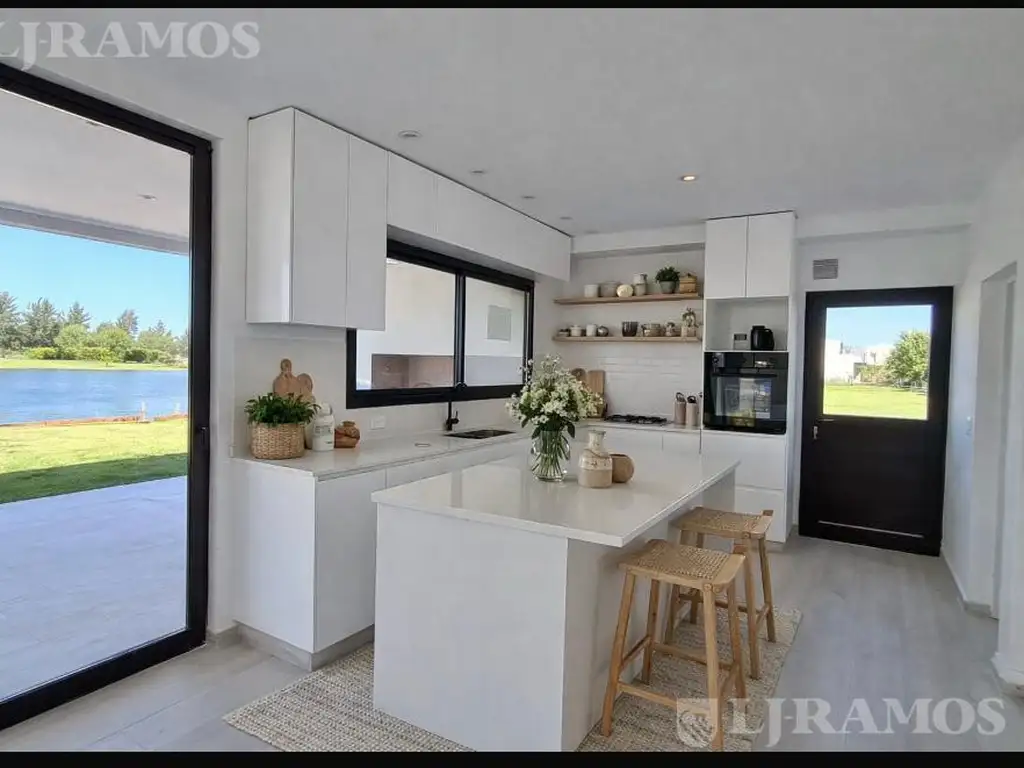 La cocina, equipada con amoblamiento moderno, horno, anafe y grifería de primera calidad, se complementa con una mesada de mármol que añade un toque de elegancia. En la planta baja, encontrará un recibidor, dependencia con baño, lavadero interno, cocina, comedor diario, y un amplio living con vistas panorámicas a la laguna.
