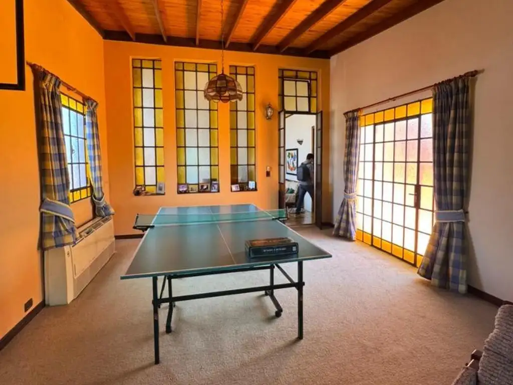 Escritorio, con pisos y detalles de madera, playroom con vitrales super luminoso.