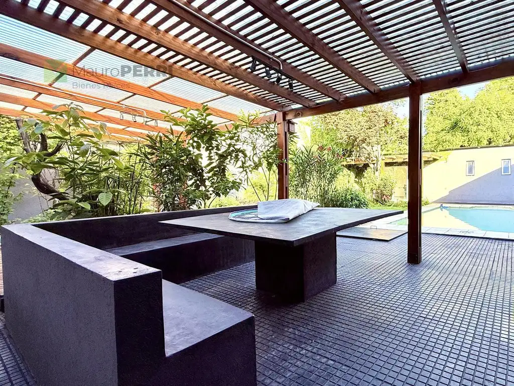 En el exterior, se disfruta de un parque verde de 170 m2 con una amplia galería techada de más de 50 m2, quincho con baño completo y galpón (aproximadamente 60 m2), además de una pérgola semicerrada con parrilla, mesa y bancos de hormigón. La piscina de 8 x 4 m está equipada con bomba, filtro Vulcano, control automático e iluminación, ideal para disfrutar en familia o con amigos.