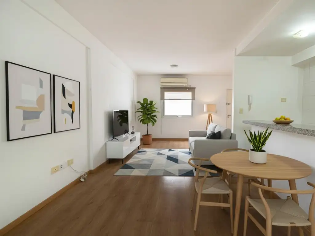 El departamento, al frente con orientación norte, ofrece 60,10 m² totales en excelente estado. Presenta un gran living comedor muy amplio y divisible, con balcón corrido; cocina abierta con mesada doble de granito, alacenas completas y conexión para lavarropas. Dormitorio con vestidor y baño completo. Tiene servicio de gas y aproximadamente 15 años de antigüedad. En la terraza del edificio hay parrilla de uso común.