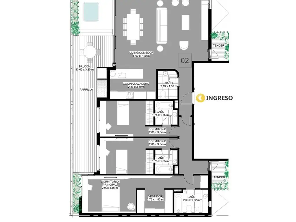 Se compone de área social principal con estar comedor, cocina integrada o semi integrada, sector privado con tres dormitorios, baños completos y amplias expansiones exteriores. Pileta en la terraza.