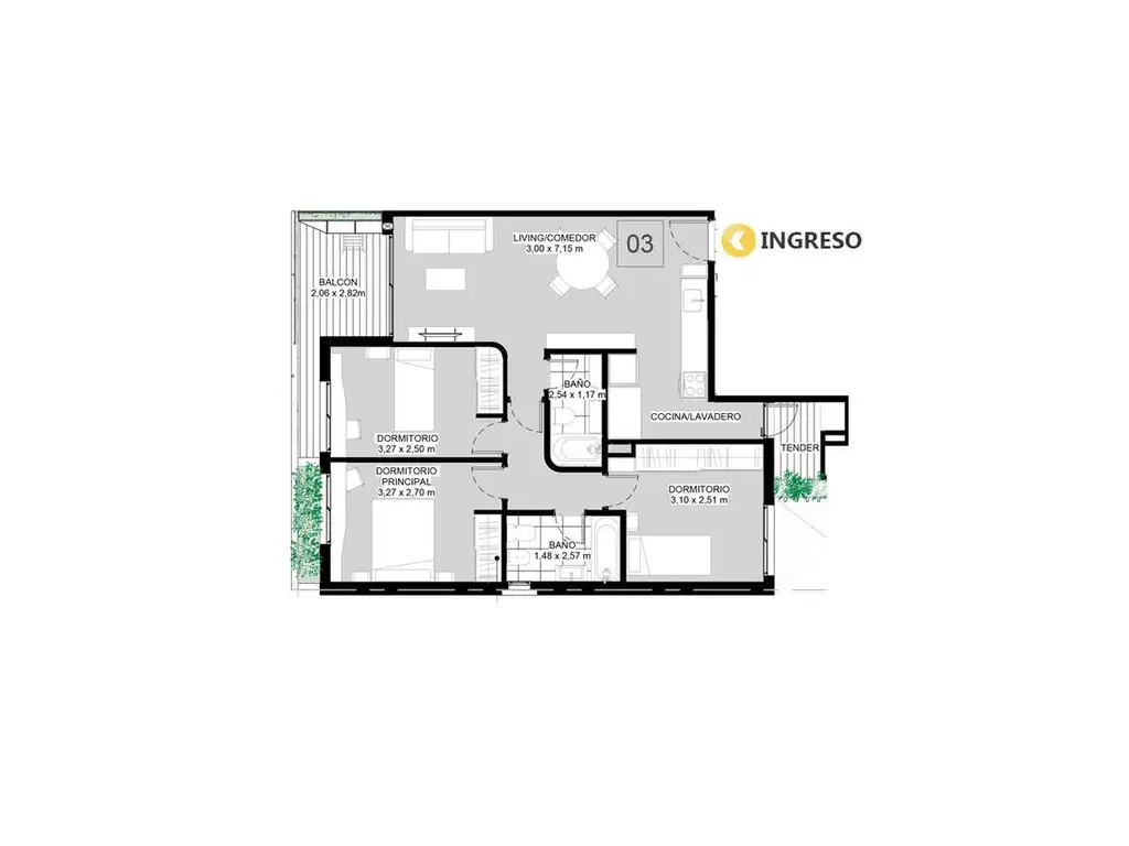 Cuenta con estar comedor, cocina integrada, balcón, tres dormitorios y baño completo. La organización interior permite un funcionamiento práctico para vivienda familiar, con buena iluminación natural.