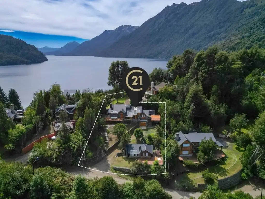La casa principal cuenta con un living comedor amplio con vista plena al LAGO Nahuel Huapi y al Correntoso, con una cocina integrada y una pequeña despensa. En planta baja se encuentran los tres dormitorios, uno de ellos con baño en suite y el baño completo. El dormitorio principal posee balcón con vista al lago.