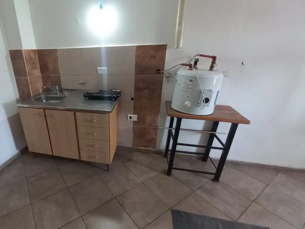 Ingresamos a un patio compartido con otra unidad, por escalera se ingresa al departamento hacia la derecha al ambiente con bajo mesada, termotanque 50lts, anafe de 2 hornallas y hacia la izquierda al baño con espacio de ducha.