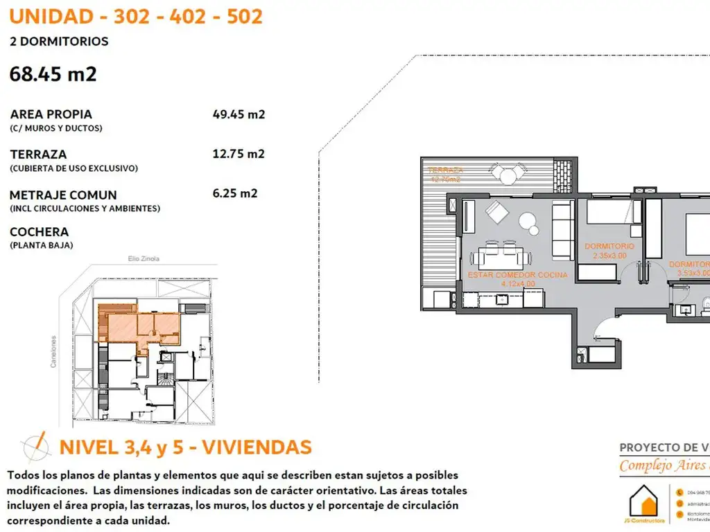 La unidad 502 se encuentra en el quinto piso en la esquina de Manuel Oribe (Canelones) y Elio Zinola lo que le da una gran vista despejada, buena iluminación y ventilación. Tiene 2 dormitorios, living- comedor con cocina integrada, baño y lavadero distribuidos en 50m². También cuenta con terraza de uso exclusivo de 13m² con parrillero propio. Se destacan terminaciones como los pisos de porcelanato, las aberturas de aluminio, cortinas de enrollar en dormitorios, mesadas de granito, artefactos de loza y grifería de primera calidad.