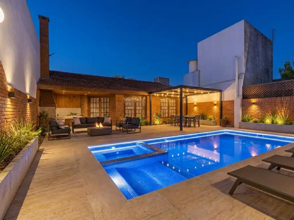El jardín parquizado conecta con un quincho equipado con cocina, baño y capacidad para 50 personas, ideal para eventos. La construcción es sólida, con materiales de primera calidad, incluyendo un techo de teja y revestimiento exterior de piedra Mar del Plata.