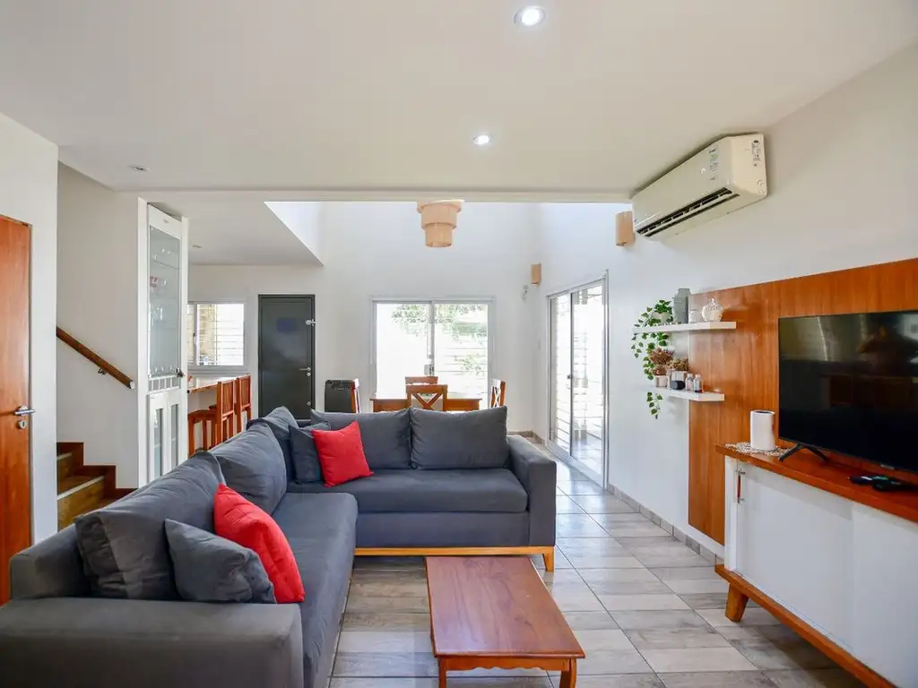 Living comedor de doble altura con ingreso de luz natural y salida al jardín mediante galería semicubierta. Cocina semi integrada mediante barra desayunadora, con muebles de alacena y bajo mesada, mesada de granito, campana extractora y espacio para lavarropas. Baño completo con ventilación natural. Espacio de guardado bajo escalera. Cochera pasante para dos vehículos con portón automatizado.