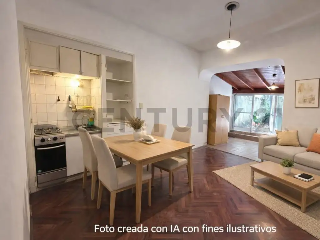 La unidad se desarrolla en planta baja y cuenta con patio propio, agua caliente central y cocina a gas.