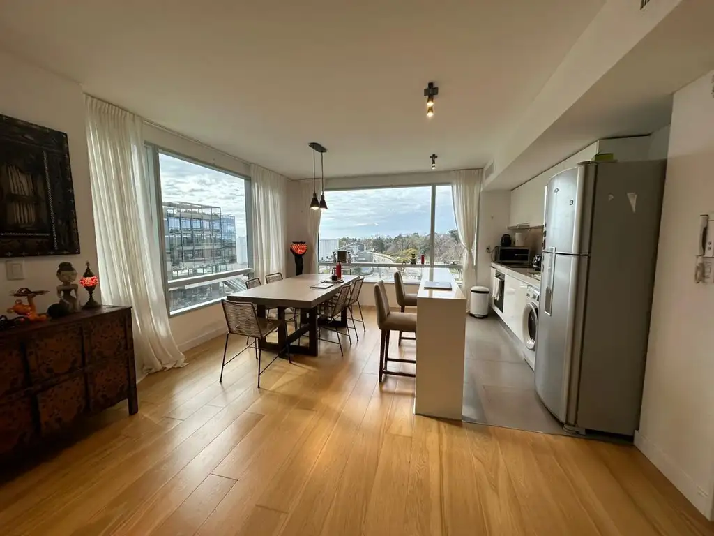 Living, estar-comedor con salida al balcón. Toilette de recepción. Cocina integrada, equipada con muebles de bajo mesada y alacenas. Las mesadas son de Silestone. Cuenta además con anafe vitro-cerámico y horno eléctrico línea GLEM (Italiano).
