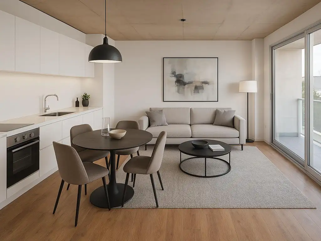 + Cocina, mesada de Silestone o similar, bajo mesada en melanina con frentes laqueados y correderas metálicas, anafe (eléctrico) + horno (gas) de acero inoxidable,