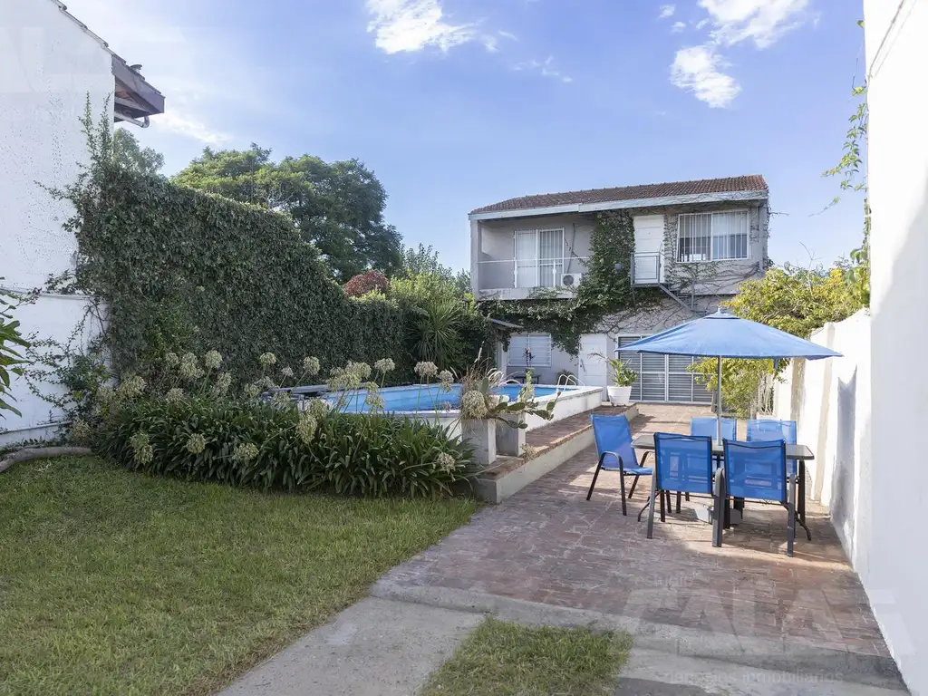 La casa se encuentra sobre un lote de 365 m2 y cuenta con entrada pasante para autos, con capacidad aproximada para 5 vehículos. En el exterior se destaca un amplio parque arbolado, ideal para disfrutar del aire libre, junto con piscina y baño de servicio ubicado al lado de la misma.