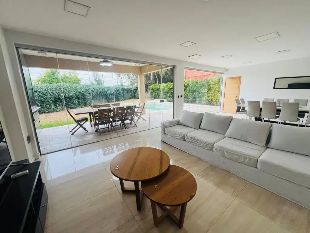 El diseño moderno se destaca con carpintería de aluminio y ventanas de doble acristalamiento, asegurando luminosidad y eficiencia energética. La casa está equipada con aire acondicionado individual y losa radiante, garantizando confort en todas las estaciones. La cocina es un primor donde la calidez se comparte en una hermosa isla y la calidad se cierra en los muebles de guardado y grifería.