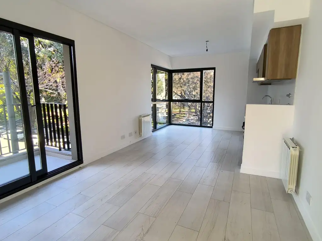 Ambiente principal con amplios ventanales sobra la esquina, y cocina integrada con cocina a gas y conexión para lavarropas.
