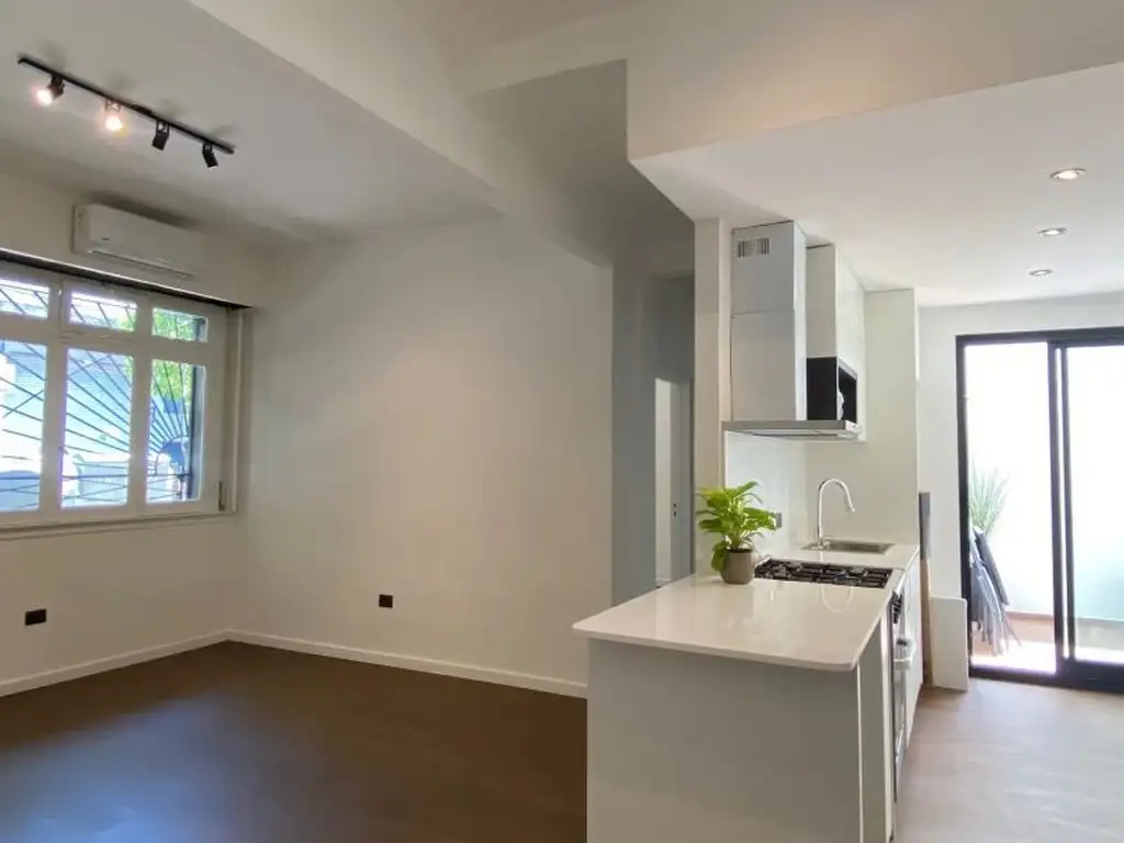 Apto profesional. Departamento a estrenar de 2 ambientes, al frente en PB. Superficie total de 55m2, cubierta de 50m2 y descubierta de 5m2. Un dormitorio, un baño completo. Living-comedor, cocina integrada a gas natural. Patio. Lavadero. Excelente estado, luminoso. Pisos de madera.