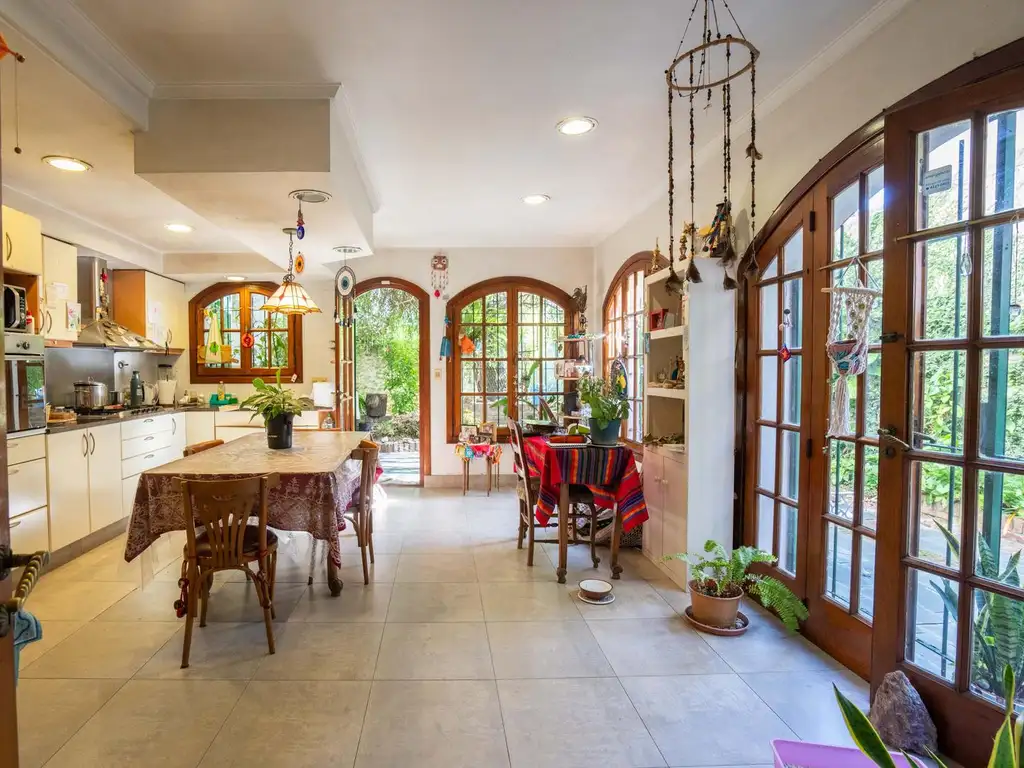 En planta baja se encuentran dos ambientes principales que pueden funcionar como living y comedor, un toilette de recepción y una cocina de generosas dimensiones, con gran espacio de guardado y lugar para comedor diario. Desde la cocina se accede directamente al jardín, uno de los grandes atractivos de la propiedad, con abundante verde y espacio ideal para disfrutar al aire libre. En este sector se encuentra la parrilla, perfecta para reuniones y momentos en familia o con amigos.