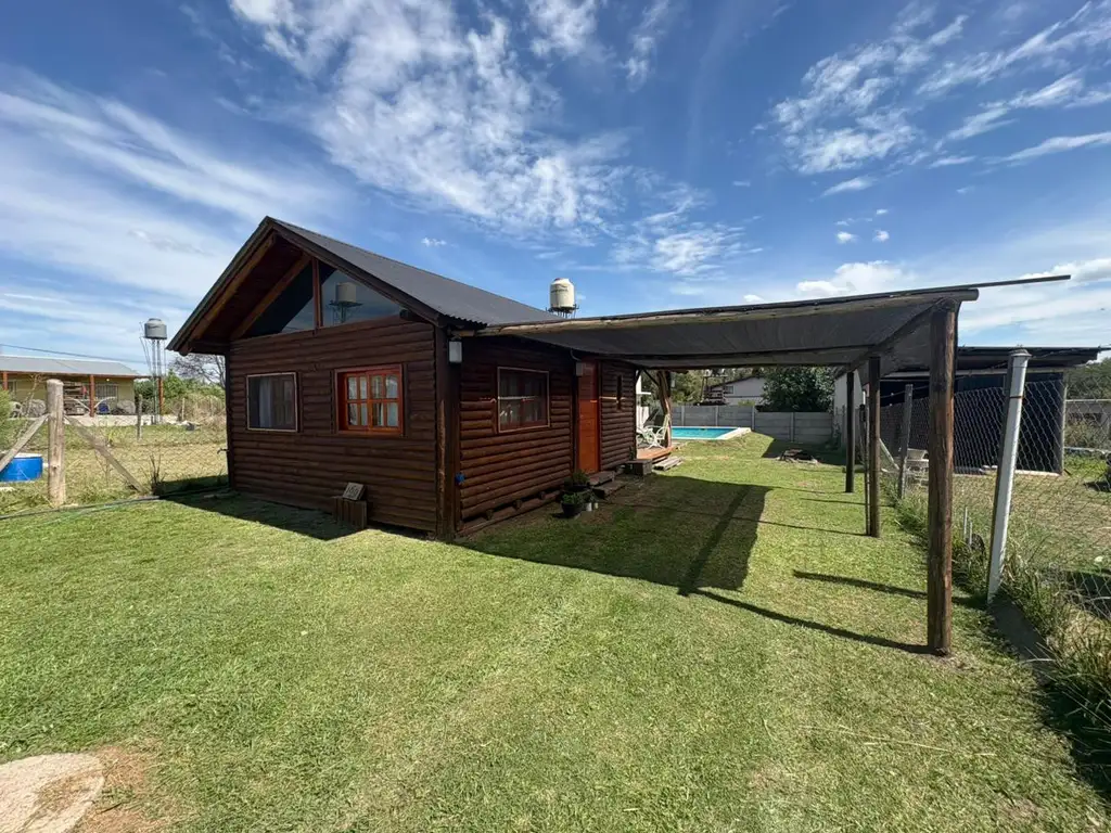 Cabaña monoambiente construida totalmente en madera que consta de cocina, baño con ducha y pequeña galería. Pérgola de troncos y media sombra para vehículo y piscina de 8 m. x 4 m. con bordes atérmicos y equipo de filtrado. Baño de servicio exterior.
