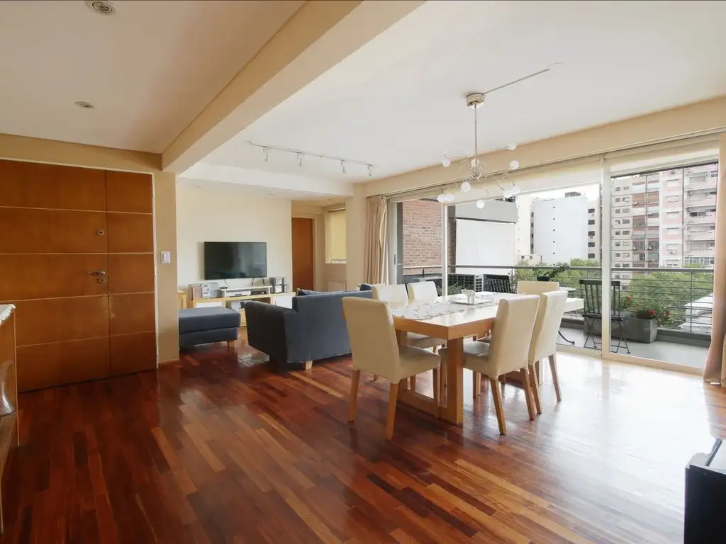 Gran living comedor apaisado con enorme ventanal y salida a balcón semi aterrazado.