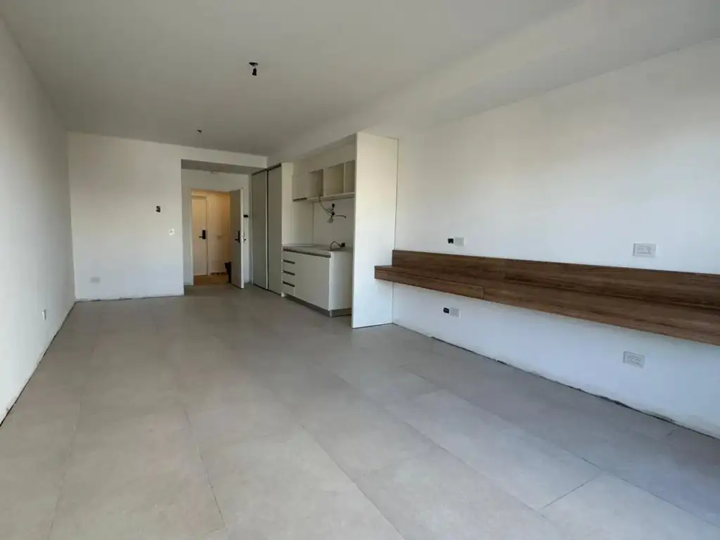 La unidad cuenta con un baño completo de 1,50m x 2,10m. A continuación se encuentra el living comedor con cocina integrada de 5.82m X 4.42m con salida al balcón de