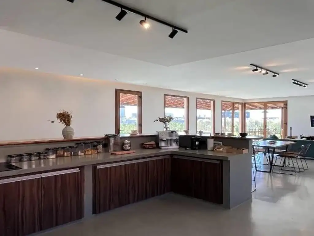 La cocina posee doble sistema de cocción (gas y eléctrico) y se complementa con lavadero independiente. El confort térmico está garantizado todo el año mediante losa radiante y equipos de aire acondicionado.
