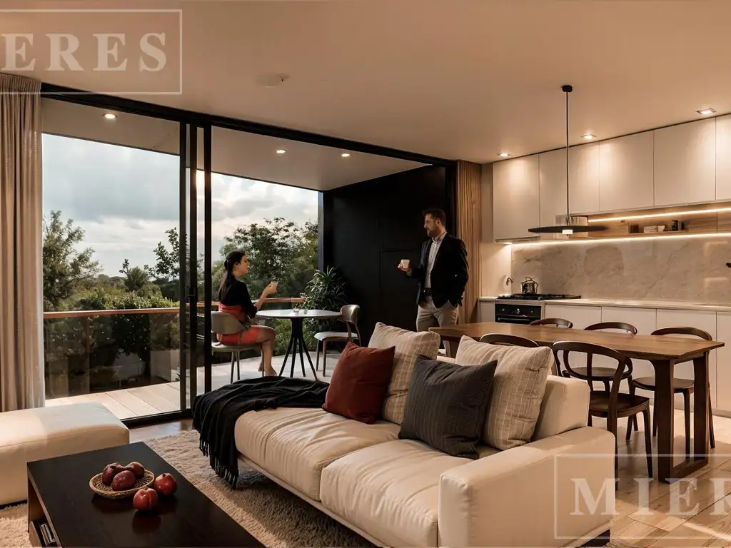 DESCRIPCION Y DETALLES TECNICOS: Departamentos con Hall de acceso. Cocina semi-integrada con hornos y anafes en acro inoxidable empotrados en muebles bajo mesadas los muebles de cocina son de terminaciones en aluminio. Mesada de cocina en Silestone. Grifería de alta gama FV con cierre cerámico. Living - comedor con salida a un cómodo balcón con parrilla. Toilette de recepción. Dormitorio principal en suite con placard con interior/exterior de alta gama en aluminio pintado de color oscuro. Aires acondicionados F/C instalados en cada ambiente. En los baños Vanitorys colgantes , espejos en baño y toilettes iluminados por leds en sus perímetros, mampara de vidrio templado. Pisos porcelanato símil madera. AMENITIES: Piscina y jacuzzi en terraza amplia con solárium en deck totalmente equipado con amoblamiento de primera calidad de la marca MIKE OUTDOORS Amplio S.U.M. cubierto totalmente equipado con aire acondicionado frio calor, baño completo, cocina completa con amoblamiento bajo mesada y alacenas, horno y anafe empotrados de acero inoxidable. Provisión de amoblamiento de primera calidad, sillones, mesas ratonas, mesas de comedor, iluminación, TV Smart 65" Amplio ROOFTOP, con parrilla y pérgola para organizar eventos al aire libre. El edificio cuenta con una gran terraza con parrillas, piscina y solárium. Gimnasio. Circuito cerrado de cámaras de seguridad en accesos y halls comunes.