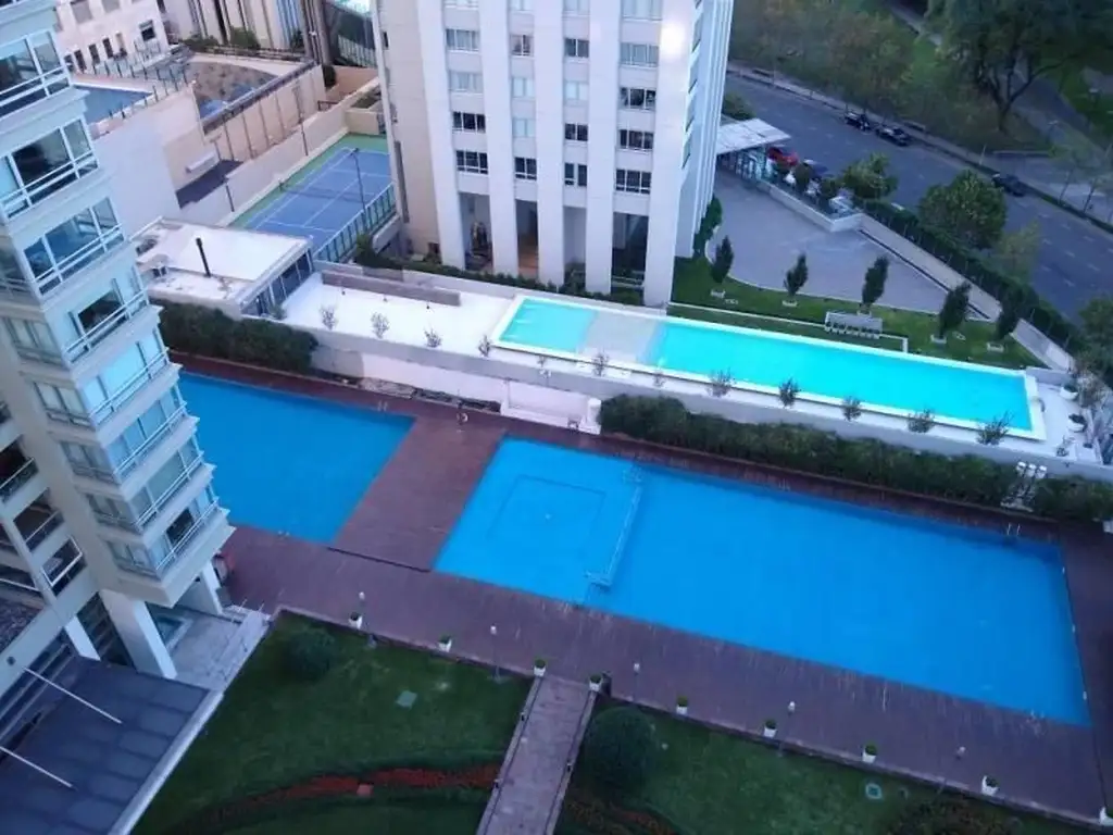 Una cochera cubierta en 2º subsuelo con baulera. Antigüedad 12 años. Expensas $699.000 (marzo 2026). Torre de 42 pisos, 4 departamentos por piso. Amenities: tres piscinas de más de 20m cada una, salón de juegos para niños, SUM, gimnasio, vestuario, sauna, vigilancia 24hs. Apto credito