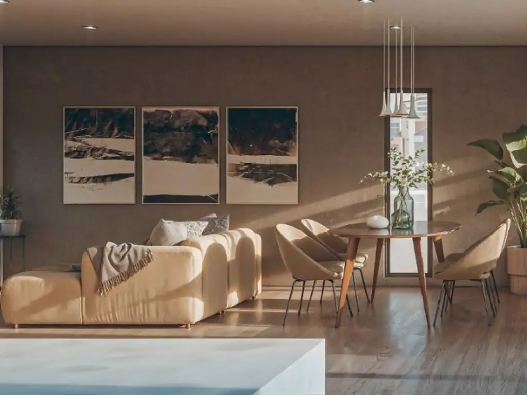 Al ingresar, te recibe un imponente sector social de concepto abierto donde el living y el comedor se integran de manera fluida con una cocina de diseño contemporáneo. Este gran ambiente destaca por su luminosidad y su conexión directa con una terraza exclusiva, que rodea gran parte del departamento y funciona como una verdadera extensión del hogar al aire libre.