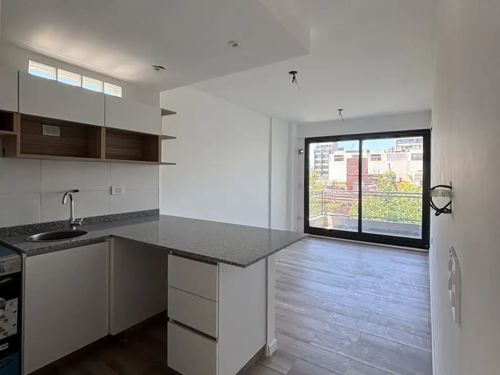 Unidad en piso alto, mucha luz, vista abierta, amplio balcón, cocina con barra desayunadora, living de gran tamaño, dormitorio principal con placard con puertas corredizas de piso a techo, baño completo con bañera.