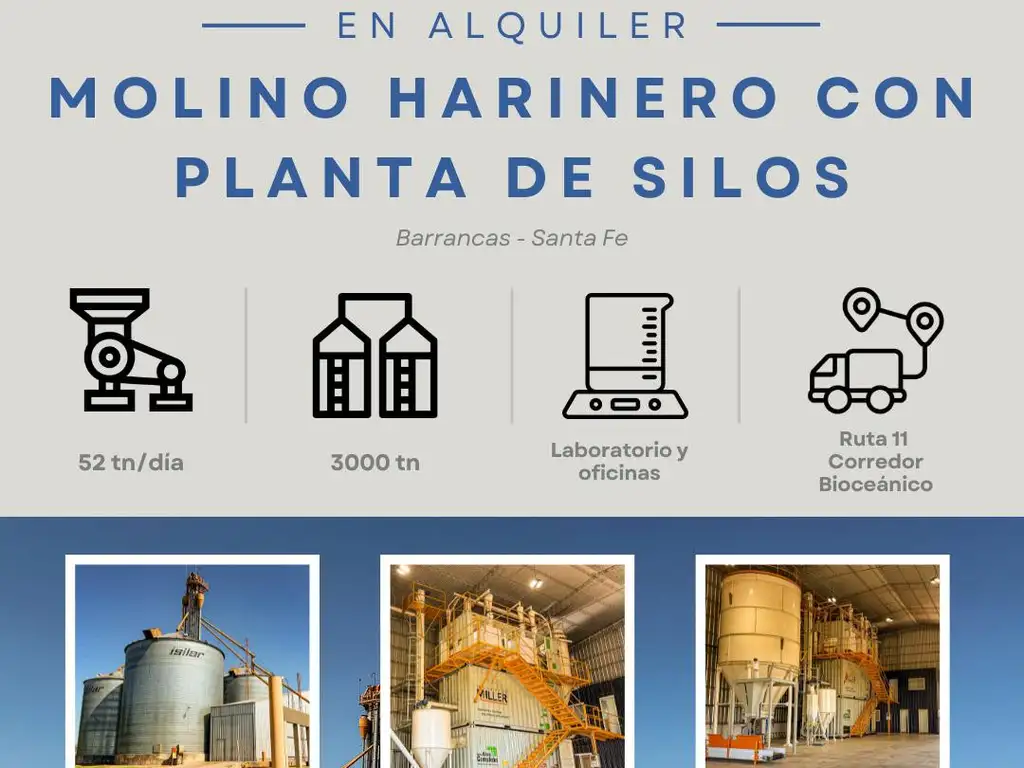 Se ofrece en alquiler un MOLINO HARINERO MULTICEREAL A ESTRENAR, diseñado para una operación eficiente y de alta calidad. La planta cuenta con todas las habilitaciones necesarias para su funcionamiento inmediato.