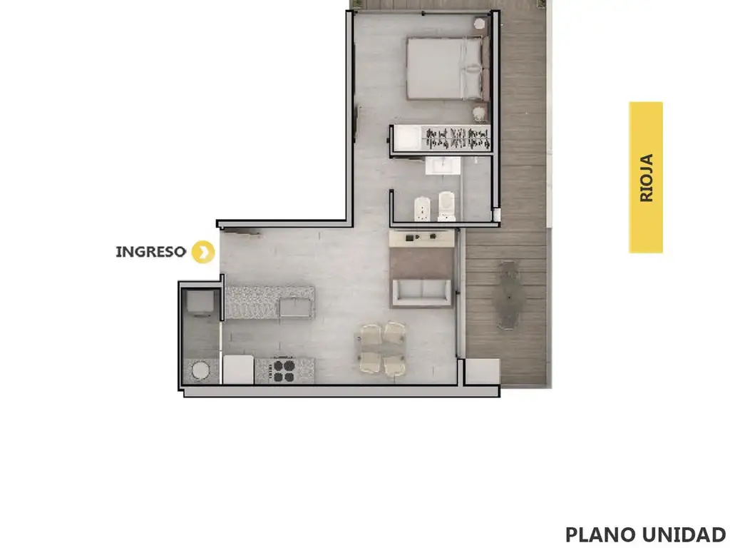Ingreso a estar comedor con salida a balcón terraza sobre la esquina de Rioja y Moreno. Cocina integrada equipada con muebles de alacena y bajomesada completos. Dormitorio con placard con interiores terminados. Baño completo con griferías y sanitarios de primera marca.