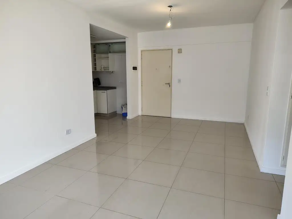 Amplio Living-comedor con cocina incorporada; ventanal de acceso al balcón corrido. Piso de porcelanato.