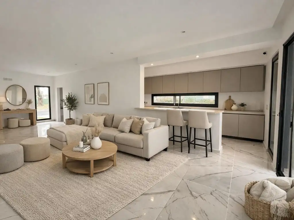 La casa cuenta con un amplio living, comedor y cocina integrados, generando un espacio social moderno y muy luminoso. La cocina posee mesadas de Silestone, bacha Johnson y gran capacidad de guardado, además de una práctica barra divisoria.