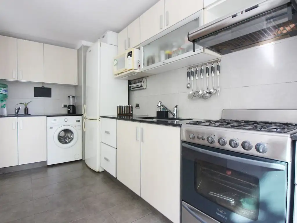 - Cocina a gas, de 4.00 x 2.20 m2, al frente, independiente con excelente ventilación, muebles en alto y bajo mesada de excelente calidad con guarda canto de aluminio, mesada de mármol con doble bacha, pisos y revestimientos en porcelanato, todo en muy buen estado, espacio lavadero integrado.