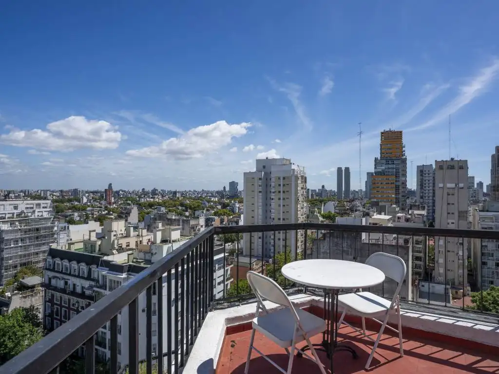 Alquiler en Palermo. Departamento muy luminoso en esquina. Lleno de sol directo siendo último piso. Vista abierta desde todos los ambientes. Palier privado. Living comedor muy amplio con salida a balcón y vista abierta. Toilette. Un dormitorio en suite con salida a balcón. Cocina con conexión para lavarropas. Son 93 metros totales. El departamento tiene mucho lugar de guardado. Se alquila con o sin los muebles de las fotos. Orientación Oeste. Solo se acepta gato como mascota. Calefón a Gas. Calefacción por aire acondicionado. Encargado con vivienda con horario de portería. Dos ascensores. Edificio apto profesional. No tiene acceso para discapacitados.