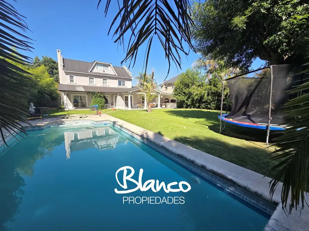 Exterior: galería techada con parrilla, piscina y solárium en un amplio jardín.