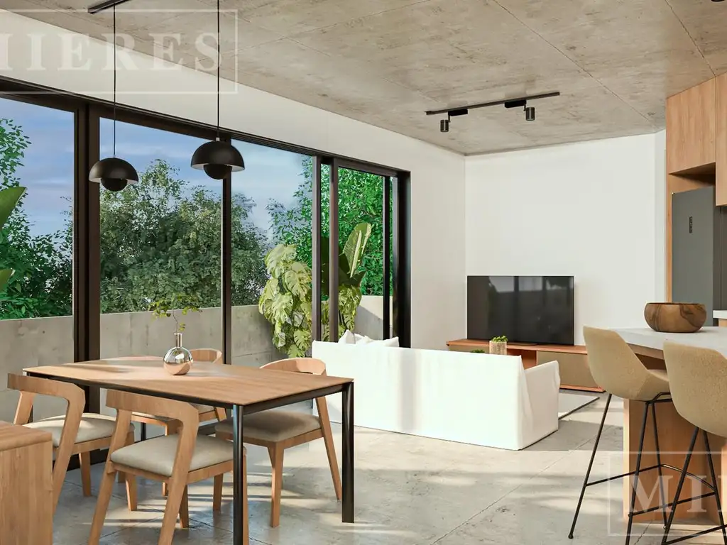 Especificaciones técnicas: pisos vinílicos símil madera, terminaciones de techo y balcones de hormigón visto, A/A frío calor, aberturas DVH, mesadas de mármol tipo silestone, termotanque eléctrico en cada unidad, y portones eléctricos para las cocheras.