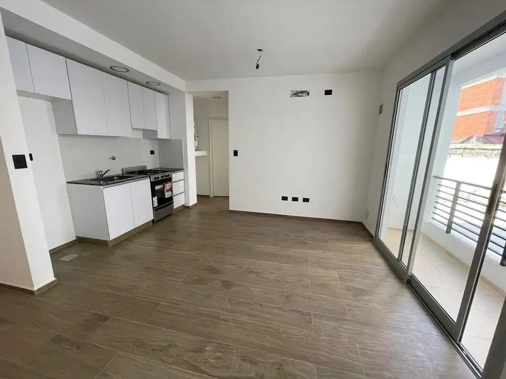 Living comedor con cocina integrada, salida a balcón en L