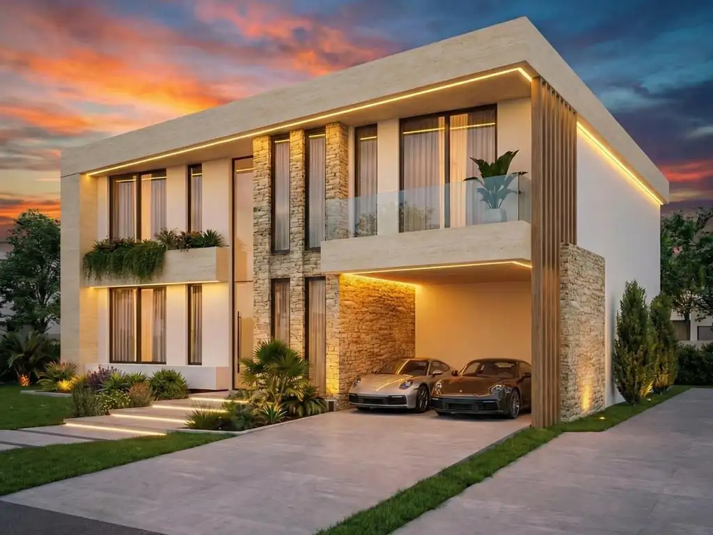 - PB: hall en doble altura, oficina con baño completo, living-comedor con cocina integrada, mueble de TV con biochimenea. Quincho cerrado con parrilla, isla, baño completo, living-comedor con mueble de TV con biochimenea. Cuarto de guardado.