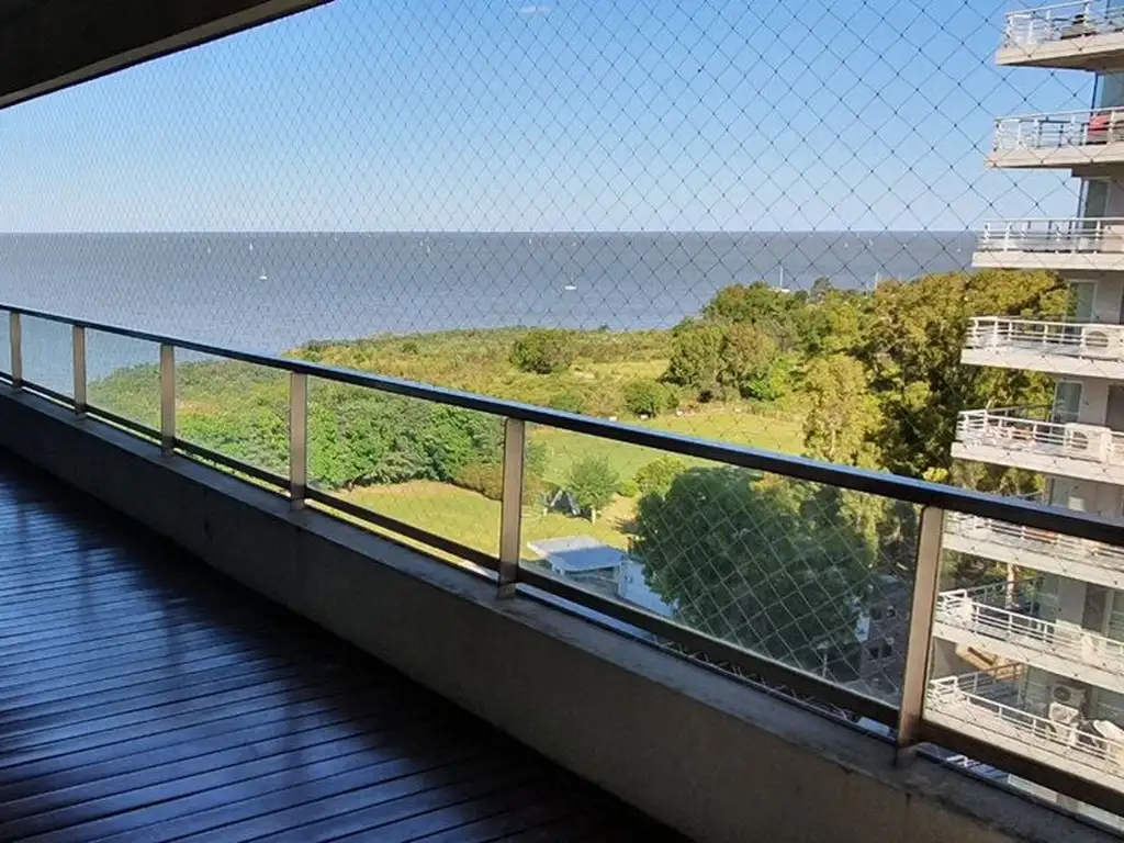 El departamento cuenta con una amplia distribución que incluye un living comedor con salida a un gran balcón terraza perimetral con deck, ofreciendo una vista.al rio .