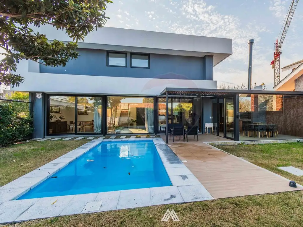 Planta baja: hall de recepción, luminoso living con estufa a leña conectado al comedor principal estar independiente con salida al jardín, y piscina climatizada. Moderna cocina con comedor diario, lavadero, lavavajilla y amplios placares de guardado. Primer dormitorio con placard y baño completo.