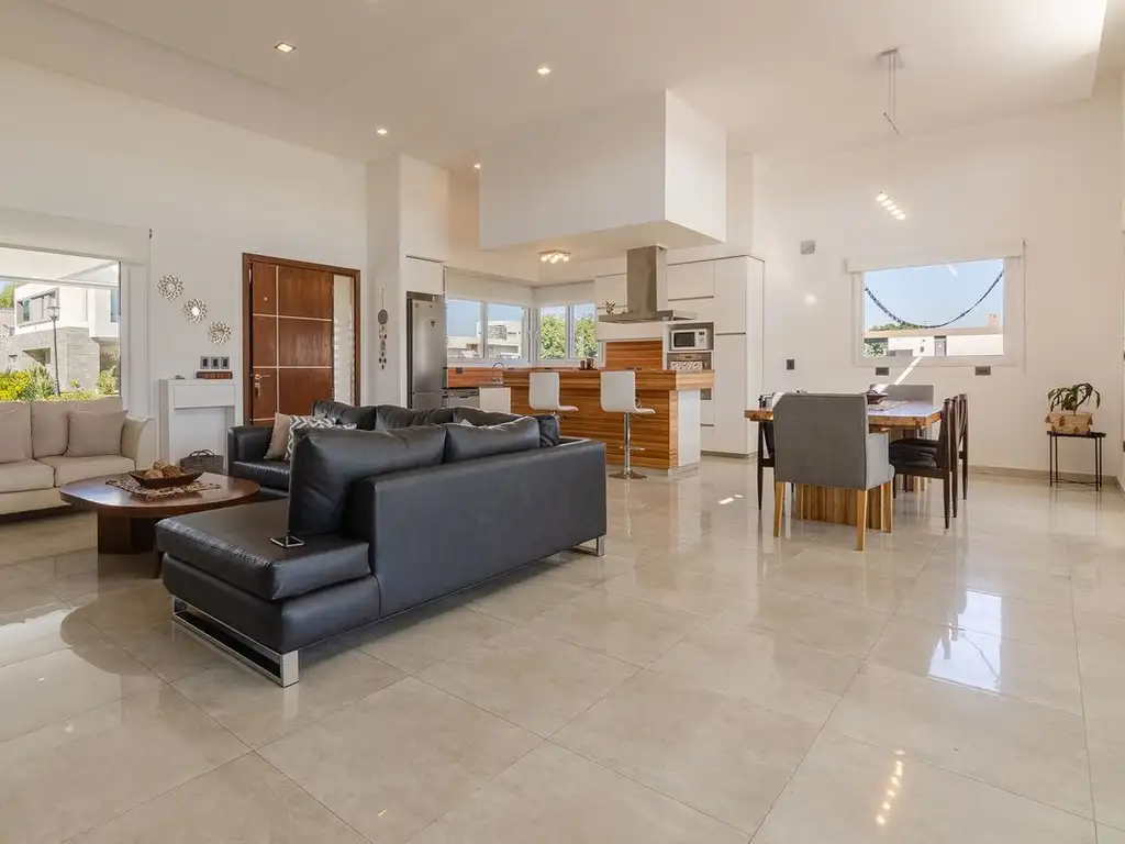 Al ingresar nos encontramos un hall, con cocina integrada y gran ventanal que nos dirige hacia la parte trasera de la propiedad donde tenemos la pileta, el quincho, la parrilla y el parque muy amplio.